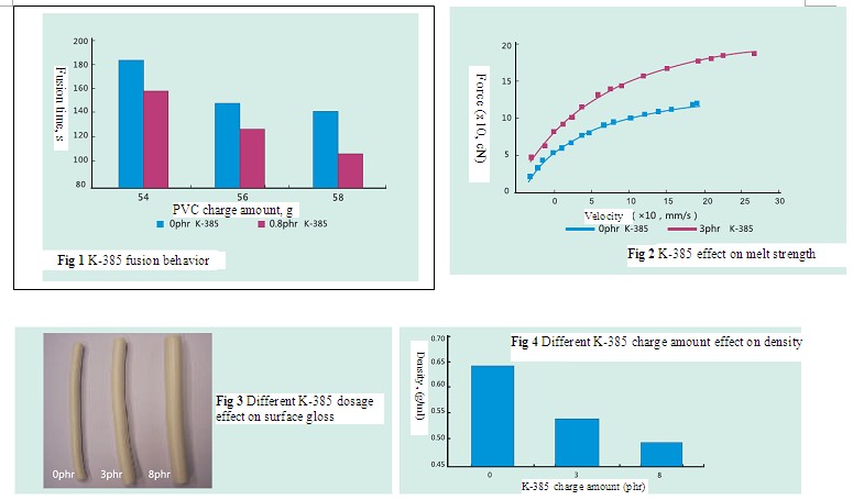 K-385 could improve PVC fusion behavior greatly and make PVC fusion more uniform, which further improves the surface gloss and finishing product quality. As shown in Fig1, K-385 could accelerate the PVC fusion.