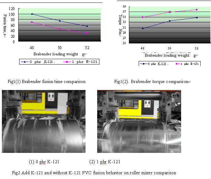 K-121 could improve greatly the PVC fusion behavior. It will make PVC more fusion uniform, improvement on surface uniformity and product quality. Fig1(1)shows K-121could accelerate PVC fusion.