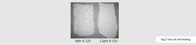 Fig.2 shows two finished specimens prepared on two roll mill based on 1.5phr K-123 and 0phr K-123, the result demonstrates K-123 could improve PVC fusion, and obtain better surface uniformity and gloss.